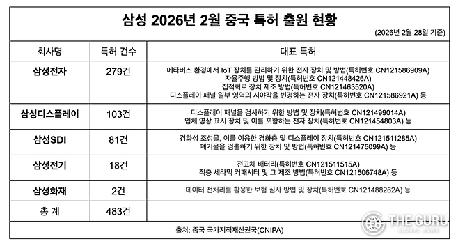 10일 중국 국가지적재산권국(CNIPA)에 따르면 CNIPA는 지난달 삼성전자와 삼성디스플레이, 삼성SDI, 삼성전기, 삼성화재 등이 지난 2019년부터 작년 12월까지 출원한 특허 483건을 승인했다. 이는 작년 같은달 승인 건수(665건) 대비 약 27.4% 감소했지만 2024년 2월 승인된 463건과 비교하면 약 4.3% 증가한 규모다.