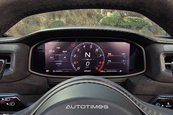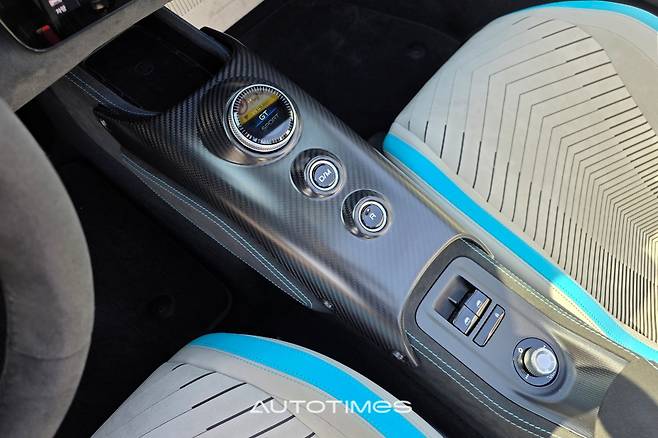 센터 터널에는 꼭 필요한 버튼만 마련했다. 주행 모드를 바꿀 수 있는 조그셔틀과 전자식 변속 버튼, 창문 스위치와 볼륨 조절이 전부다. 여기에 주변을 감싸는 패널은 온전히 카본이다. 딱 한 가지 아쉬운 건 컵홀더다. 맨 뒤에 한 개 있는데 차 안에서 음료를 마시는 건 쉽지 않아 보인다. 대신 앞쪽에 깊고 넓은 휴대폰 무선충전패드가 있어 위안을 삼는다.