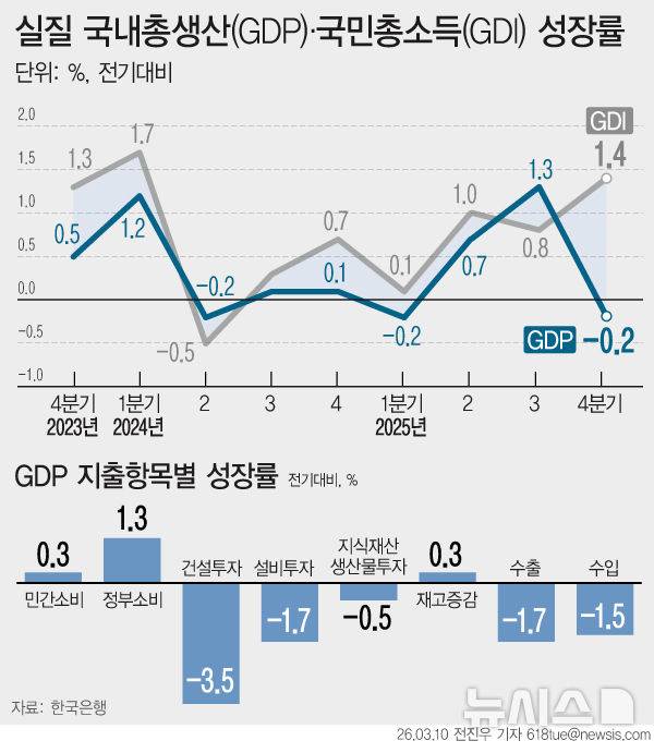 [서울=뉴시스] 10일 한국은행에 따르면 지난해 4분기 국내총생산(GDP) 성장률이 -0.2%로 역성장했다. 지난해 1분기 이후 상승 전환했지만, 건설투자와 설비투자가 감소하며 성장률을 다시 끌어내렸다. (그래픽=전진우 기자)