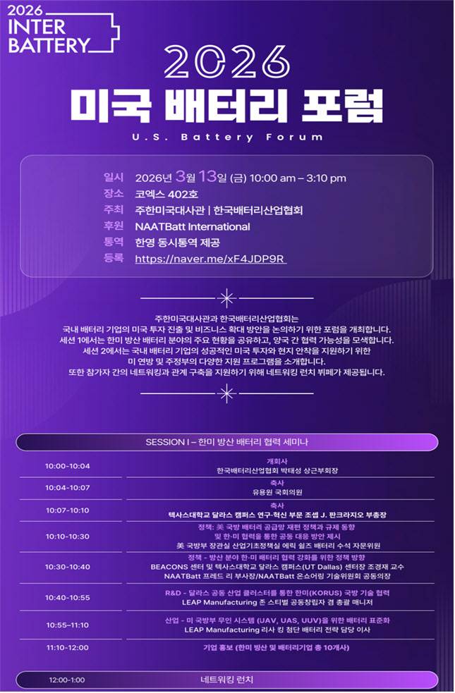 이번 세미나에는 미국 국방부, 텍사스대 댈러스 캠퍼스(UT Dallas)의 BEACONS 센터, LEAP Manufacturing 관계자를 비롯해 한·미 방산 배터리 전문기업들이 참여한다. 한미 방산 배터리 협력을 주제로 열리는 첫 양국 세미나다.