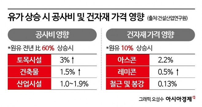 유가 상승 여파는 토목 현장에서 가장 크게 나타날 것으로 전망된다. 한국건설산업연구원은 원유 가격이 60% 상승할 경우 토목시설과 건축물 공사비가 각각 3.0%, 1.5%가량 상승할 것으로 추산했다. 토목 공사가 유가 상승에 가장 크게 타격을 받는 건 아스콘(아스팔트 콘크리트) 때문이다. 아스콘은 도로 포장의 핵심 자재로 원가에서 석유가 차지하는 비중이 70%에 달해 유가에 민감하게 반응한다. 건산연은 원유 가격이 10% 상승할 경우 아스콘 가격이 약 2.2% 오를 것으로 전망했다. 주택 현장에서 큰 비중을 차지하는 레미콘과 철근 가격은 각각 0.5%, 0.1%씩 상승할 것으로 관측했다.
