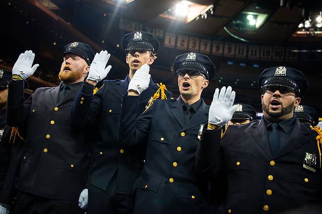 [뉴욕=AP/뉴시스] 9일(현지 시간) 미국 뉴욕 매디슨 스퀘어 가든에서 열린 뉴욕경찰(NYPD) 경찰학교 졸업식에서 졸업생들이 선서하고 있다. 2026.03.10.