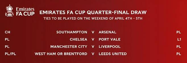 아스널은 챔피언십(2부)의 사우샘프턴을 만나고, 첼시는 선덜랜드를 꺾는 대이변을 일으킨 리그1(3부)의 최하위팀 포트베일FC와 맞닥뜨린다. 첼시와 포트베일이 공식 경기에서 충돌하는 것은 1929년 이후 97년 만이다.