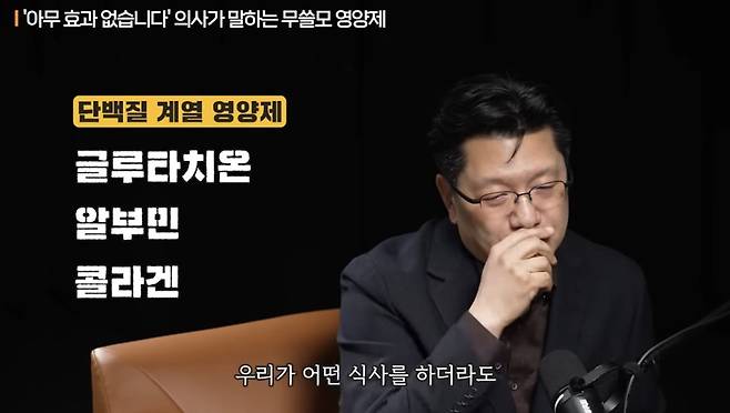 이 교수는 "글루타치온, 알부민, 콜라겐 이런 영양제들은 우리가 어떤 식사를 하더라도 다 분해된 다음에 흡수한다"며 "단백질은 전부 아미노산으로 분해되고 지방은 지방산으로 분해된 다음에 흡수한다. 즉 음식을 먹지만 성분으로 흡수한다는 것"이라고 강조했다.