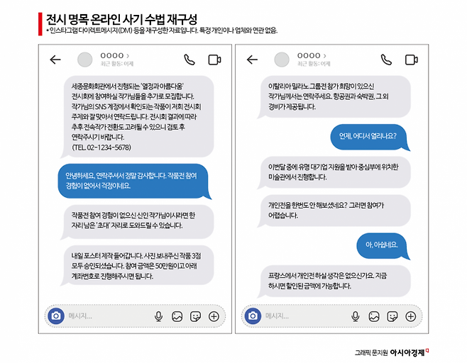 신진 작가 김정미씨(가명)는 인스타그램에서 이런 다이렉트메시지(DM)를 받았다. 개인 계정에 올려둔 작품 이미지를 보고 연락했다는 A씨는 해외 유명 아트페어를 언급하며 "부스를 확보하려면 비용을 먼저 입금해야 한다"고 설명했다. 그의 계정에는 유명 업체와 협업한 것으로 보이는 홍보 포스터 등이 1000개 넘게 게시돼 있었다. A씨는 "500만원이면 해외에서 전시를 열 수 있다"고 꼬드겼다. 김씨는 결국 60만원을 먼저 송금했지만, 막상 받아든 문서에는 환불 제한 조항 등 작가에게 일방적으로 불리한 내용이 포함돼 있었다. 김씨가 뒤늦게 계약 취소를 요구하자 A씨는 돌연 태도를 바꿔 '무식하다', '당신 같은 초짜가 뭘 알겠느냐' 등 폭언을 퍼부었다.
