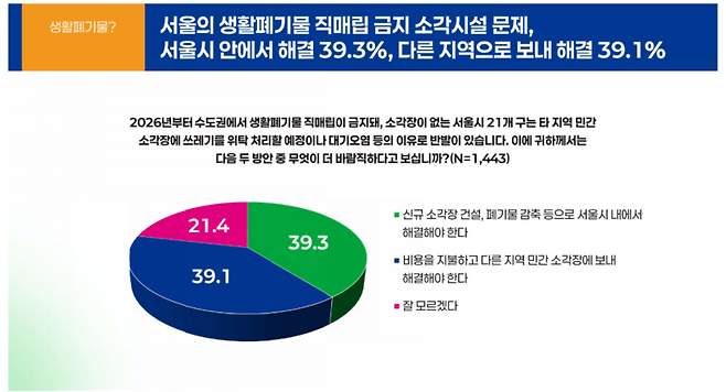서울 유권자들은 '소각장이 없는 서울의 21개 구 쓰레기를 다른 지역에서 처리하는 것에 대한 반발이 있다. 어떤 방법이 바람직하냐'고 물었을 때, '신규 소각장 건설, 폐기물 감축 등으로 서울시 내에서 해결해야 한다'는 응답이 39.3%, '비용을 지불하고 다른 지역 민간 소각장에 보내 해결해야 한다'는 응답이 39.1%로 나타났습니다. 21.4%는 '잘 모르겠다'고 했습니다.