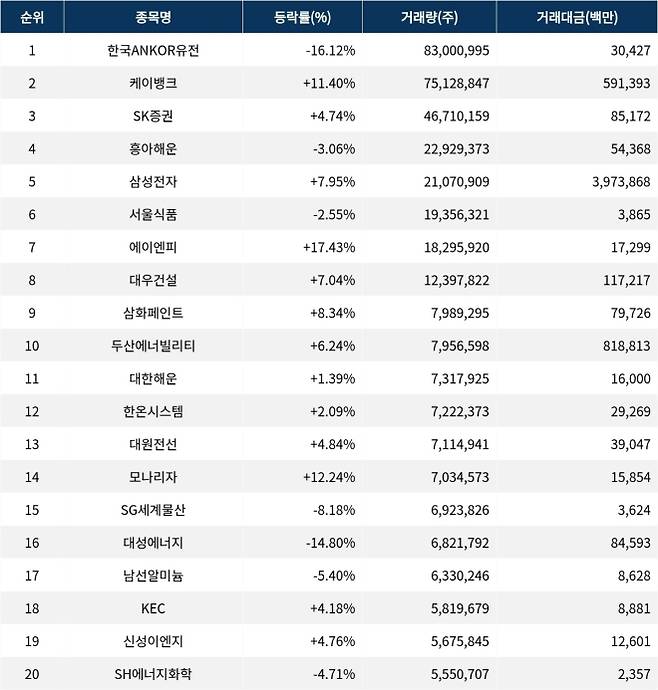 한편 거래량 상위 20위권 종목들은 대한해운(005880) ▲1.39%, 한온시스템(018880) ▲2.09%, 대원전선(006340) ▲4.84%, 모나리자(012690) ▲12.24%, SG세계물산(004060) ▼8.18%, 대성에너지(117580) ▼14.80%, 남선알미늄(008350) ▼5.40%, KEC(092220) ▲4.18%, 신성이엔지(011930) ▲4.76%, SH에너지화학(002360) ▼4.71% 등의 성적을 기록했다.
