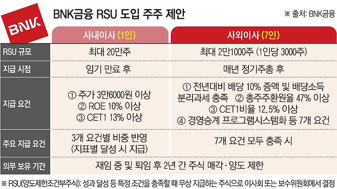 BNK금융은 이미 주가 연동 보상 체계를 충분히 운영 중이라며 RSU 도입에 신중한 입장이다. BNK금융 관계자는 “경영진 성과급의 40% 이상을 3년 이상 이연해 지급 할 시 주가와 연계하는 방식으로 단기 성과주의를 억제하고 있다”며 “오히려 사외이사에게 주식을 지급할 경우 경영진을 감시해야 할 이사회의 독립성과 객관성이 훼손될 우려가 있다”고 말했다.