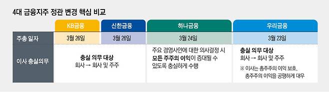 10일 금융권에 따르면 4대 금융지주(KB·신한·하나·우리)는 이번 정기 주총 안건에 정관 변경을 포함하고 이사의 충실의무 대상 확대를 반영할 예정이다. 개정 상법은 이사가 직무를 수행할 때 회사뿐 아니라 주주 전체의 이익도 함께 고려하도록 했다. 이에 따라 금융지주 이사회가 주요 경영 의사결정 과정에서 주주 이익 보호 여부를 보다 적극적으로 검토해야 하는 구조로 바뀌게 된다.