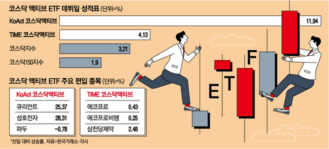 국내 최초의 코스닥 액티브 상장지수펀드(ETF)가 동시에 출격하면서 '액티브 ETF 명가'들이 엄선해 담은 종목들로 투자자 눈길이 쏠렸다.
