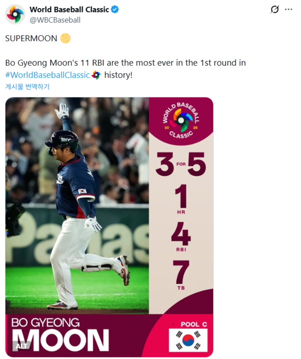 이에 문보경을 향한 새로운 별명이 생겼다. 심지어 국내도 아닌 해외에서 붙였다. '슈퍼문'이다. 1라운드에서의 맹활약 덕에 메이저리그(MLB)나 WBC의 SNS 공식 계정에서 '슈퍼문'이라는 별칭을 적극적으로 사용하고 있다.