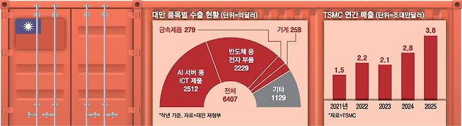 대만 재정부에 따르면 그래픽처리장치(GPU)가 탑재된 AI 서버 등 정보통신 및 영상제품은 지난해 전년보다 89.5% 증가한 2512억달러(약 368조원)로 품목별 수출 순위 1위를 차지했다. 반도체 등 전자제품 부품은 같은 기간 25.8% 늘어난 2229억달러(약 326조원)로 2위에 올랐다.