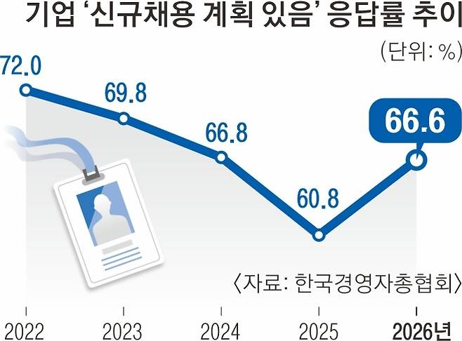 한국경영자총협회(경총)가 임직원 수 100명 이상 기업 500개를 대상으로 조사해 10일 발표한 '2026년 신규 채용 실태'에 따르면 응답 기업의 66.6%가 '올해 신규 채용 계획이 있다'고 답했다.