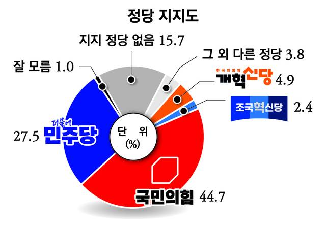 정당 지지도 조사에서는 국민의힘이 44.7%로 가장 높은 지지율을 기록했다. 이어 더불어민주당 27.5%, 지지 정당 없음 15.7%, 개혁신당 4.9%, 기타 정당 3.8%, 조국혁신당 2.4%, 잘 모름 1.0% 순으로 나타났다. 전체적으로 국민의힘이 더불어민주당보다 약 17%포인트 높은 지지율을 보이며 우세한 정치 지형을 형성하고 있는 것으로 조사됐다. 다만 무당층도 15.7%로 적지 않은 비중을 차지했다.