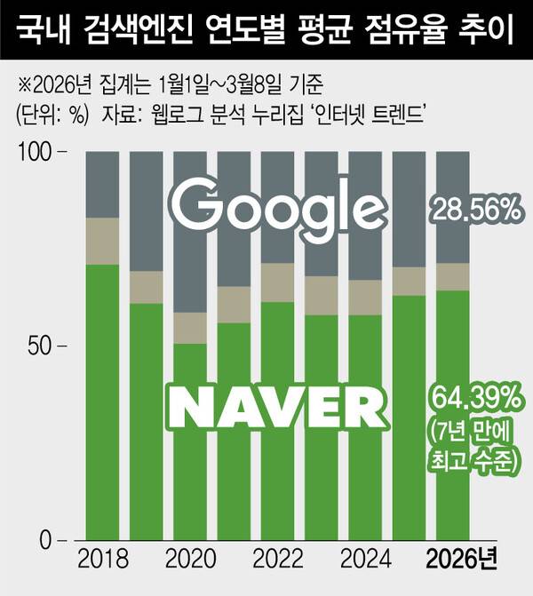 10일 웹로그 분석 누리집 ‘인터넷 트렌드’를 보면, 올해 들어 국내 검색 엔진 시장에서 네이버 점유율(1월1일~3월8일 평균)은 64.39%로, 2019년 이후 가장 높은 수준을 기록했다. 네이버 점유율은 2018년 71.17%를 기록한 뒤 2020년 50.67%까지 떨어졌지만, 2024년 이후 다시 상승 흐름을 보이고 있다. 다만, 네이버 쪽은 시기별로 검색 점유율 편차가 큰 만큼 외부 업체의 집계 결과를 유의미한 지표로 보긴 어렵다는 입장이다.