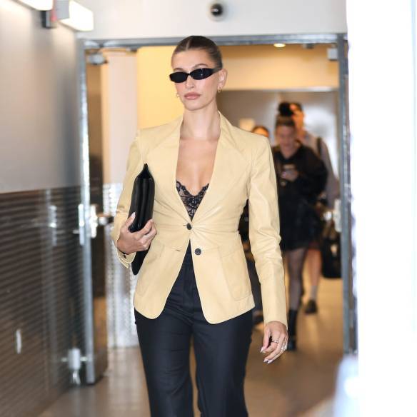 경쾌한 분위기를 자아내기 위해 컬러의 명도를 과감하게 끌어 올리는 것만큼 확실한 방법이 또 있을까요? 가죽 재킷도 예외는 아닙니다. 보기만 해도 산뜻한 감상을 자아내는 헤일리 비버의 페일 옐로 컬러 가죽 재킷처럼요. 헤일리는 가볍고 시어한 레이스 톱과 슬랙스로 깔끔하게 마무리했어요. 화이트나 크림처럼 화사한 컬러의 아이템과 매치해 상쾌한 무드에 시너지를 더해도 좋겠죠.