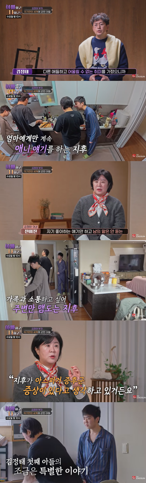 이후 모든 가족들이 부엌에서 식사를 준비했고, 첫째 아들 지후는 오로지 엄마만 졸졸 따라다니면서 애니메이션 내용을 계속 설명했다. 김정태 아내는 "자기 좋아하는 얘기만 하고 남의 말은 안 듣는다"며 "지후가 아스퍼거 증후군 증상이 있다고 생각하고 있다"고 고백했다.