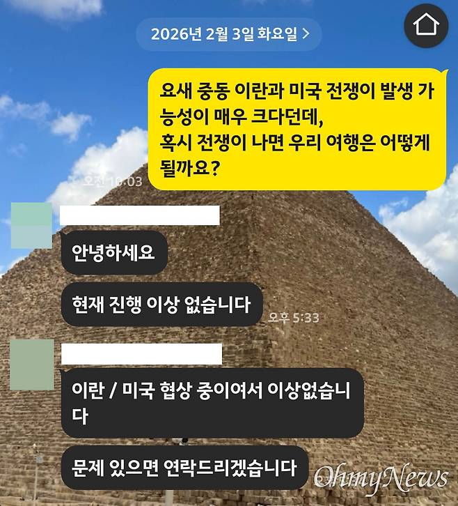 | ▲ 중동 정세가 심상치 않자 한 관광객은 여행을 보름 가량 앞둔 3일 경 여행사에 "혹시 전쟁이 나면 우리 여행은 어떻게 될까요?"고 묻기도 했다. 이에 여행사는 "현재 이란/미국 협상 중이어서 이상 없습니다"로 전쟁 가능성을 일축했다. |