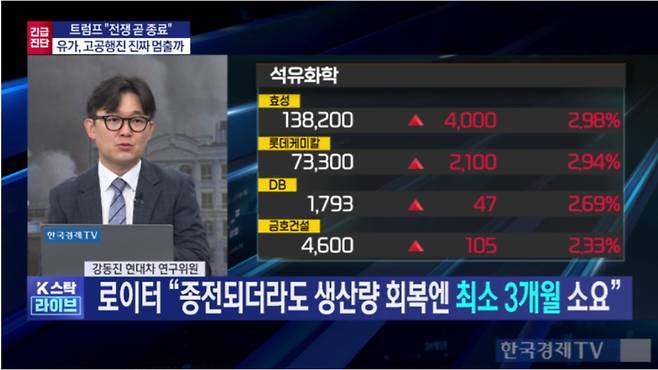 강동진 현대차증권 연구위원은 10일 한국경제TV에 출연해 "호르무즈 해협 봉쇄가 풀리고 미국·이스라엘- 이란 전쟁이 끝나더라도 국제유가가 바로 60달러대로 되돌아가긴 어렵다"며 "수급 정상화까지는 시간이 필요하다"고 말했다.