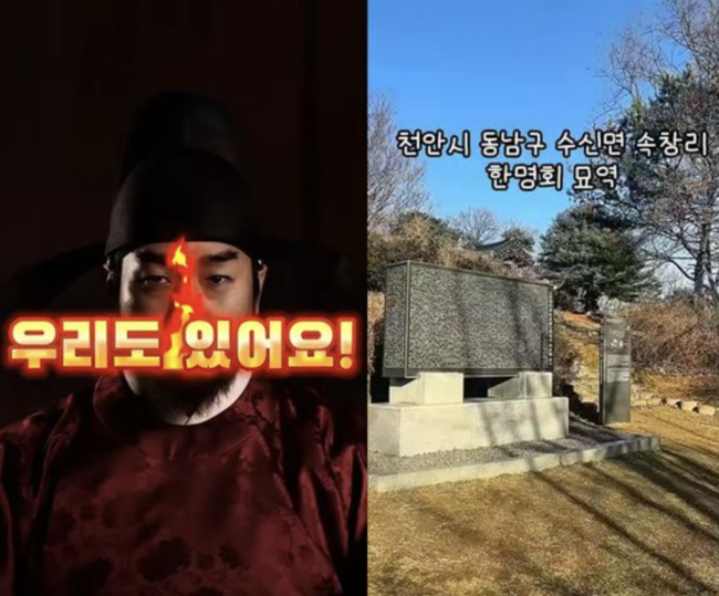 영상 속에서 천안시는 “천만 영화가 탄생하면서 영월이 아주 핫해졌다”며 “천안시도 알려야 해서 숟가락 얹어보겠다”고 유쾌하게 말문을 열었다. 이어 영화 속 인물 중 한 명의 묘소가 천안에 있다며 충남 천안시 동남구 수신면 속창리에 위치한 한명회 묘역을 소개했다.