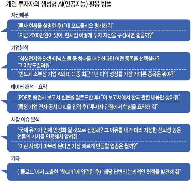 이처럼 챗GPT와 제미나이, 클로드 등 생성형 AI를 투자에 활용하는 개인 투자자들이 늘고 있다. 로이터통신은 지난해 9월 투자자의 13%가 생성형 AI를 투자에 활용하고 있다고 보도했다. 한국은 인구 대비 챗GPT 유료 이용자 비율이 세계에서 가장 높고, 국가별 매출 비중도 미국에 이어 2위다. 이를 고려하면 국내 투자자들의 AI 활용 비중은 이보다 더 높을 것으로 추정된다. 국내 투자 커뮤니티에서는 AI에 질문하는 내용을 공유하는 글을 쉽게 발견할 수 있다.