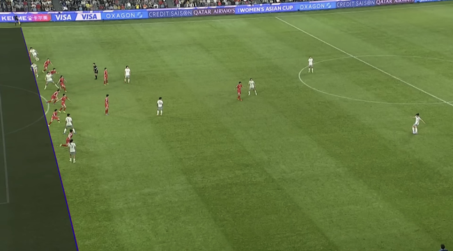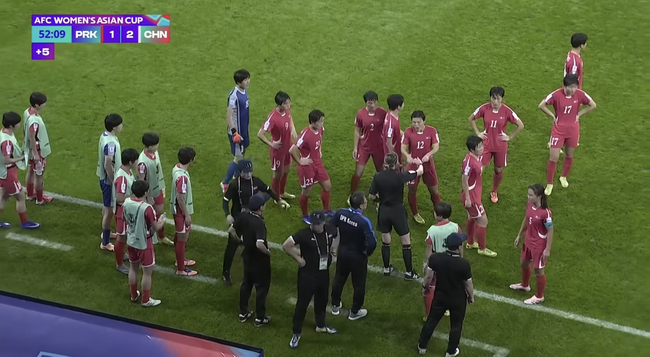 중국과 1, 2위를 놓고 조별리그 최종전에 돌입한 북한. 유리한 8강 대진을 얻기 위해 필승을 노렸다. 그러나 예상치 못한 행위로 논란을 빚었다. 상황은 전반 추가시간 발생했다. 추가시간 막바지 중국이 프리킥을 통해 골망을 흔들었다. 다만 부심은 오프사이드를 선언했고, 비디오 판독(VAR)이 진행됐다.