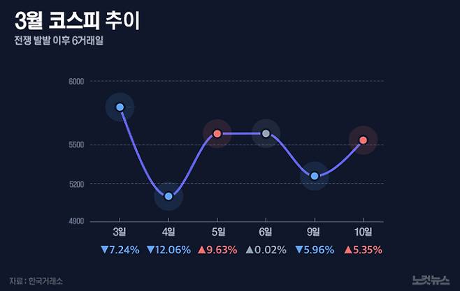 국내 증시는 특히 중동 전쟁 발발 이후로 현기증 나는 '롤러코스피(롤러코스터+코스피)' 장세를 보여주고 있다. 중동 전쟁 보도 후 첫 거래일인 3일 코스피는 하루 만에 7.24% 폭락했고, 이튿날인 4일 낙폭은 더 커졌다. 코스피 지수는 12.06% 추가 하락하며 역대 최대 일일 하락률을 기록했다. 코스피·코스닥 양 시장에 매도 사이드카가 나오고 서킷브레이커까지 발동됐다. 그러나 다음날인 5일 시장은 9.63% 급반등했다. 전쟁이 끝나거나 유가가 안정되어서가 아니라 너무 많이 떨어졌다는 심리가 시장을 뒤집으면서다.