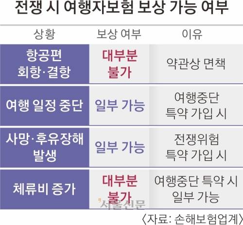 손해보험업계 관계자는 "여행자보험은 우연한 사고를 전제로 설계된 상품이라 전쟁과 같은 대규모 위험은 대부분 보장에서 제외된다"고 설명했다.