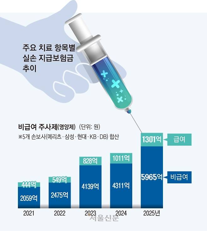 10일 서울신문이 메리츠화재·삼성화재·현대해상·KB손해보험·DB손해보험 등 5개 손해보험사 자료를 분석한 결과, 비급여 주사제(영양제 등) 관련 실손보험금은 2021년 2503억원에서 지난해 7266억원으로 약 2.9배 증가했다. 손보사 관계자는 “경증 질환에서도 비급여 주사가 관행처럼 권유되고, 환자 본인 부담은 낮게 체감되는 구조가 반복 청구를 부추긴다”고 말했다.
