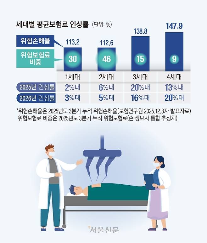 실손보험은 표준화 이후 3세대에서 도수치료·비급여주사·MRI 등 이른바 ‘3대 비급여’를 특약으로 분리했다. 4세대에서는 자기부담률을 높이고 보험료 차등제를 도입하는 등 세대 개편을 거듭해왔다. 하지만 3세대 실손보험 위험손해율은 138.8%, 4세대는 147.9%에 달해 보험료 수입보다 지급보험금이 많은 구조가 이어졌다. 위험손해율이 100%를 넘으면 보험료보다 보험금이 더 많이 나간다는 뜻이다. 보험업계 관계자는 “이용이 많을수록 보험료를 더 부담하도록 설계했지만 손해율 흐름은 좀처럼 꺾이지 않았다”고 설명했다.