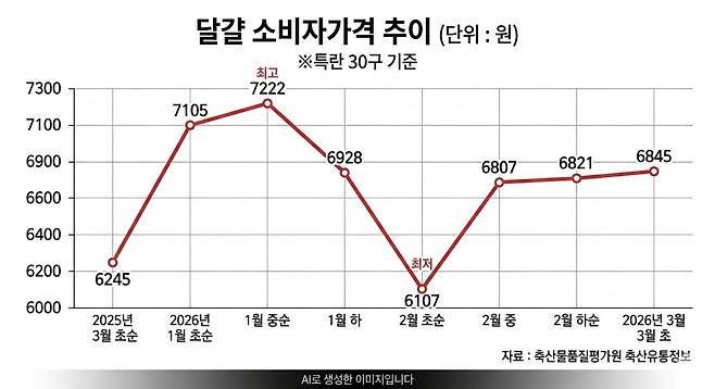 11일 축산물품질평가원 축산유통정보에 따르면 이달 초순 달걀(특란) 30구 소비자가격은 6845원으로 집계됐다.