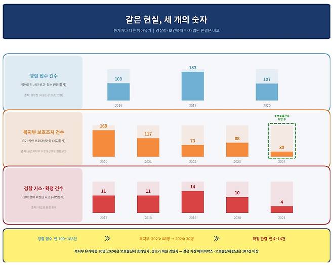 보건복지부 보호대상아동 현황보고에서 '유기'를 원인으로 한 보호조치 아동은 2020년 169명 → 2022년 73명 → 2023년 88명 → 2024년 30명으로 급감했다. 경찰 접수 영아유기 사건은 2016년 109건에서 2018년 183건으로 늘었다가 2020년 107건으로 감소했다(서울신문, 2022). 그러나 같은 기간 실제 기소·확정 사건은 연평균 10건 수준에 불과했다. 부모 중 한쪽이 자수하지 않는 한 수사 자체가 불가능한 구조이기 때문이다.
