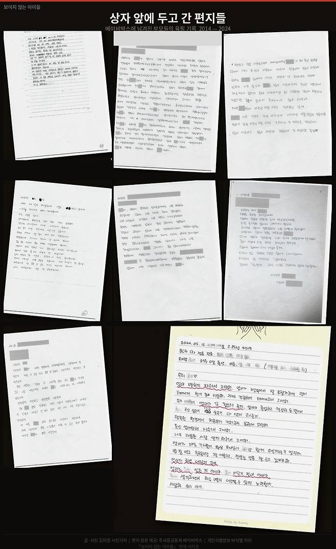 덧붙이는 글 | **[참고 통계 출처]** - 재단법인 주사랑공동체, 「기자&방송 인터뷰 관련 정보제공 — 베이비박스 현통계(2026년 1월 기준)」 - 보건복지부, 「보호대상아동 현황보고」 연도별 (2020~2024) - 보건복지부, 「2024년 출생통보제 및 위기임신보호출산제 시행 실적」 (2025) - 통계청, 「출생통계」 연도별 출생아 수 (2015~2024) - 서울신문 (2022), 경찰청 영아유기 접수·기소 통계 보도 - 아동복지법, 입양특례법, 위기임신보호출산법 관련 조항 *이 기사에 수록된 편지는 주사랑공동체의 협조로 제공되었으며, 아동 및 부모의 신원을 특정할 수 있는 모든 개인정보는 익명 처리하였습니다.*