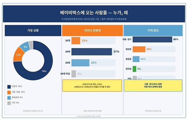 이 분포는 한 가지 질문을 남긴다. 이들이 왜 다른 합당한 경로—병원, 지자체 상담, 복지관—가 아닌 베이비박스를 택했는가. 상담 기록이 남지 않고 아이를 맡긴 사실이 알려지지 않기 때문이다. 공식 경로에 들어서는 순간 신원이 노출되는 걸 극도로 꺼리는 제각각의 사연들이 있다. 그런 사람들이 절박하게 이 문을 두드린다. 베이비박스는 제도에 닿을 수 없는 사람들이 마지막으로 닿는 곳이었다.