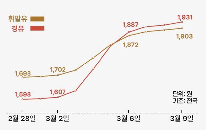 지난 10일 전국 주유소 평균 휘발유와 경유 가격은 리터당 각각 1903원, 1931원입니다. 이란 전쟁 직후(2월28일)와 비교하면 휘발유 가격은 리터당 210원, 경유는 333원 상승했습니다.