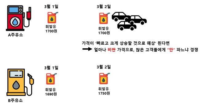 B 주유소 입장에선 손해 아닌 손해를 보는 듯한 느낌입니다. 앞으로 기름값이 더 오르면 이보다 더 큰 이윤을 남길 수 있기 때문입니다. 저장 탱크에 있는 기름이 빨리 소진되면 비싸진 기름을 사와야 할 수도 있습니다. 결국 B 주유소는 다음날 가격을 더 올려 소비자를 밀어내는 방식으로 저장탱크 지키기에 나섭니다. A 주유소 역시 마찬가지 전략을 짤 겁니다.