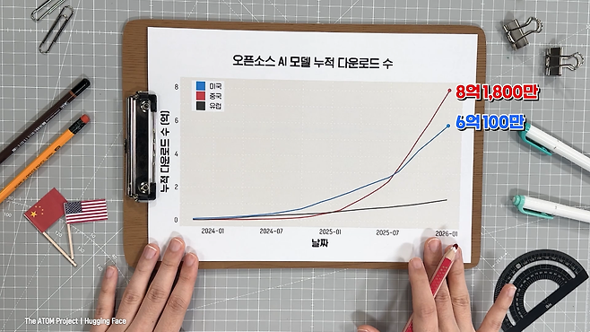 중국은 정부의 강력한 지원과 오픈소스 전략을 통해 AI 산업 규모를 빠르게 확장하고 있으며, 허깅 페이스의 오픈소스 모델 누적 다운로드 수에서 미국을 추월하며 생태계 장악을 시도하고 있습니다
