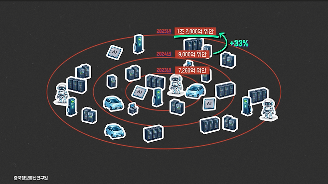 중국정보통신연구원 자료에 따르면 2024년 중국의 AI 핵심 산업 규모는 9,000억 위안을 넘어섰어요. 2023년과 비교해서 24% 증가한 수치죠. 2025년엔 2024년보다 33% 증가해서 그 규모가 1조 2,000억 위안을 돌파할 것으로 전망되고 있어요.