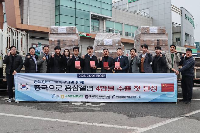 국내 프로축구단 최초로 구단 자생력 강화를 위해 지역 농협과 협력해 추진한 수익 사업이 결실을 맺었다. 지역 특산물의 중국 수출이라는 성과를 거뒀다. 충북청주FC와 충북인삼농협(조합장 소진호)은 6일 충북 증평군에 있 는 충북인삼농협 본점에서 홍삼 가공 제품 '봉밀절편홍삼당절임' 중국 광저우 수출을 위한 상차식을 개최했다.