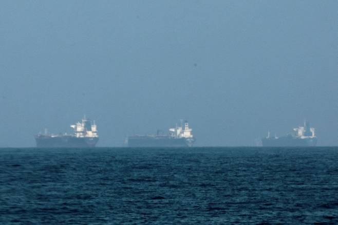 [이란이 호르무즈 해협을 통과하는 선박들에 발포하겠다고 공언함에 따라 유조선들이 아랍에미리트(UAE) 연안에 머물고 있다. (로이터=연합뉴스)]