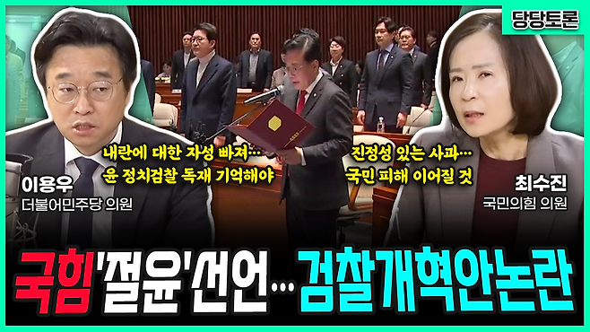 [당당토론] 국힘 ‘절윤’ 선언…검찰개혁안 논란 (이용우) “내란에 대한 자성 빠져…윤 정치검찰 독재 기억해야” (최수진) “진정성 있는 사과…국민 피해 이어질 것”