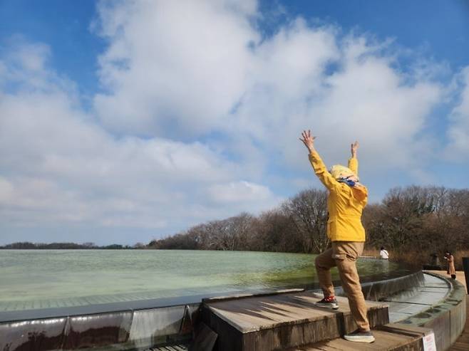 | ▲ 제주의 푸른 하늘이 내려앉은 하늘연못. 그 청명함에 취해 여행자는 두 팔을 벌려 하늘을 안는다. |