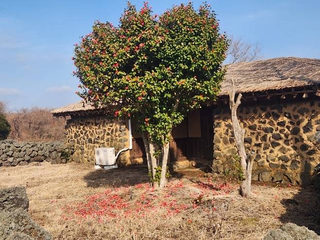 | ▲ 붉은 동백꽃이 떨어진 마당과 초가집. 제주 삶 속에서도 피어난 따스한 서정이 느껴진다. |