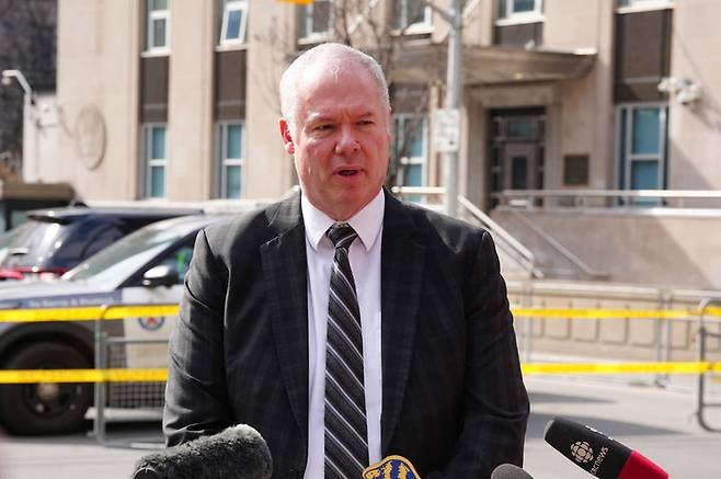 [토론토=AP/뉴시스] 온타리오주 경찰 크리스 레더 총경이 10일(현지 시간) 토론토 시내에 위치한 미국 영사관에서 발생한 총격 사건에 대해 브리핑하고 있다. 2026.03.11.