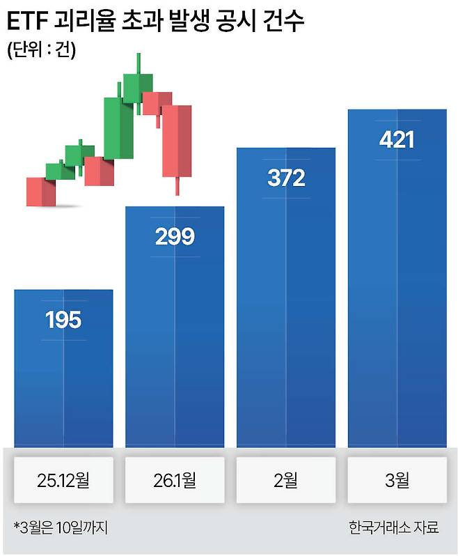 10일 한국거래소 전자공시시스템(KIND)에 따르면 이달 들어 10일까지 발생한 ETF 괴리율 초과 공시 건수는 421건을 기록했다. 6거래일 만에 지난달 전체 공시 건수(372건)를 돌파했다. 올해 누적 공시 건수는 1092건으로, 지난해 전체(3802건) 기록의 약 28.7%에 달했다.