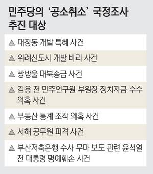 민주당이 이날 오전 국회 의안과에 제출한 국정조사 요구서는 한병도 원내대표를 포함해 소속 의원 141명이 공동 발의자로 이름을 올렸다. ‘대장동 개발 특혜’ ‘위례신도시 개발 비리’와 ‘쌍방울 대북 송금’ 등 사건과 같이 이 대통령과 측근 김용 전 민주연구원 부원장 등이 연루돼 있는 재판을 포함해 7가지를 대상으로 추렸다. 추진위원회 간사인 이건태 의원은 취재진을 만나 “이 쓰레기(공소 사건)를 정리하는 게 반드시 필요하다”고 주장했다.