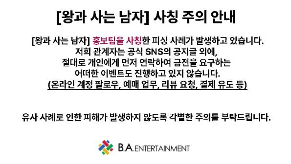 영화 '왕과 사는 남자' 제작사 비에이엔터테인먼트는 공식 홈페이지와 소셜미디어를 통해 '왕과 사는 남자 사칭 주의 안내'라는 제목의 공지를 올렸습니다.