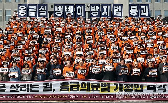 (서울=연합뉴스) 배재만 기자 = 전국공무원노조 소방본부 소속 조합원들이 11일 서울 여의도 국회 본관 앞 계단에서 응급실 뺑뺑이 방지법 통과를 촉구하며 구호를 외치고 있다. 2026.3.11