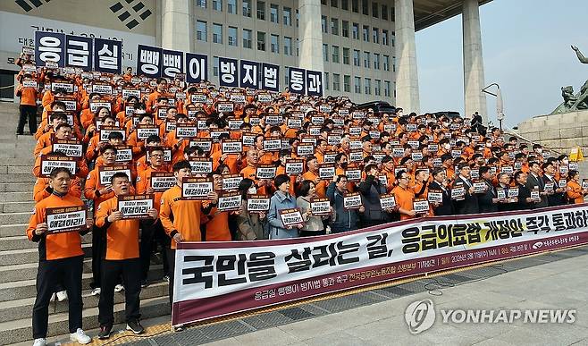(서울=연합뉴스) 배재만 기자 = 전국공무원노조 소방본부 소속 조합원들이 11일 서울 여의도 국회 본관 앞 계단에서 응급실 뺑뺑이 방지법 통과를 촉구하며 구호를 외치고 있다. 2026.3.11