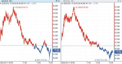 실제로 성호전자는 이날 주가가 5만 원으로 출발해 장 초반 20% 넘게 뛴 5만9천600원까지 올랐지만, 4만8천원으로 하락(-2.83%) 마감했다.